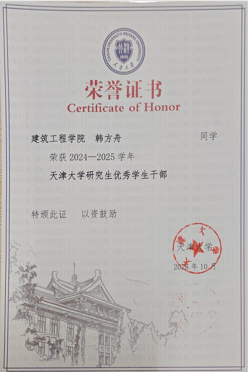 韩方舟同学荣获优秀学生干部荣誉称号