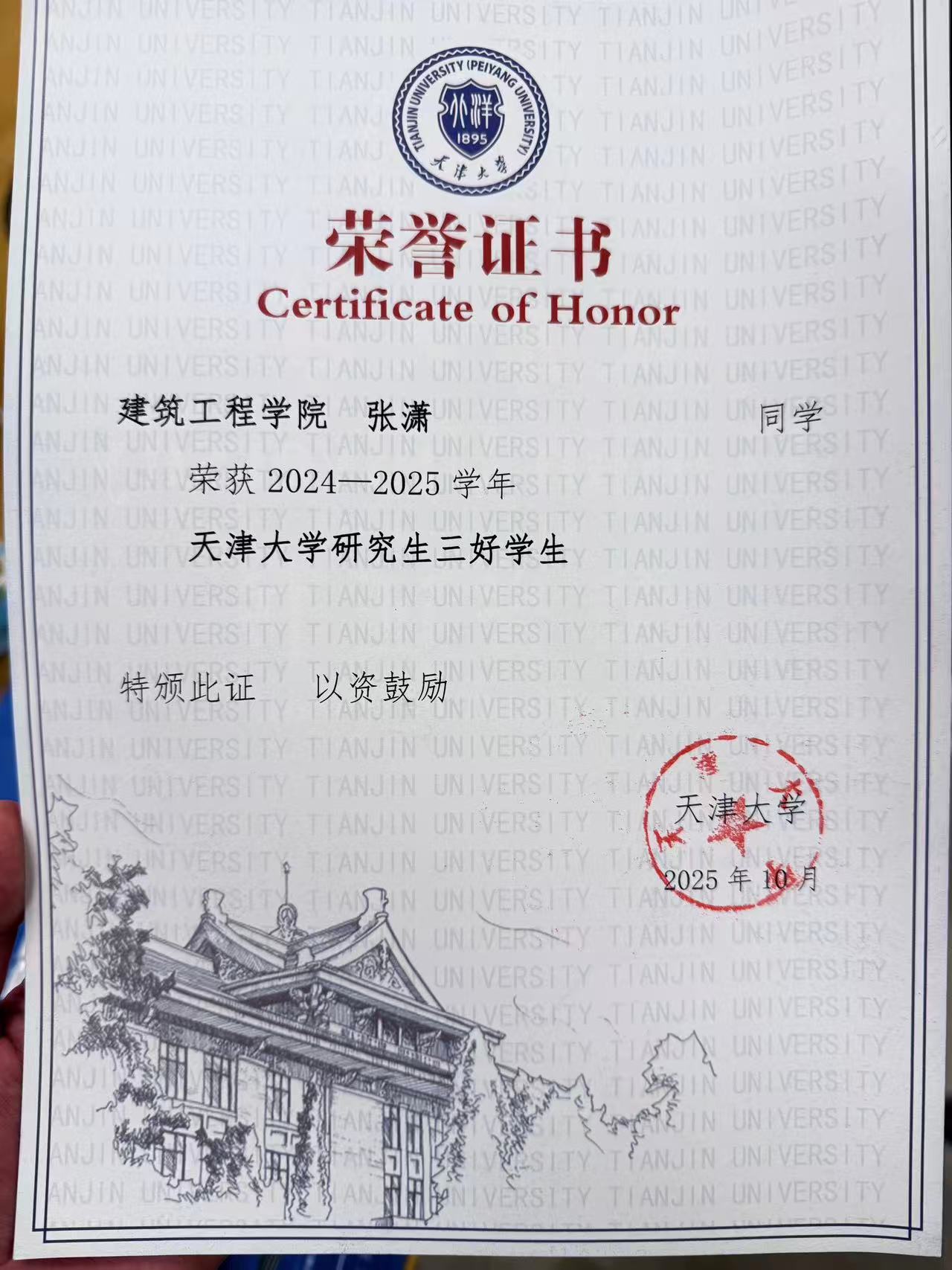 张潇同学荣获三好学生荣誉称号
