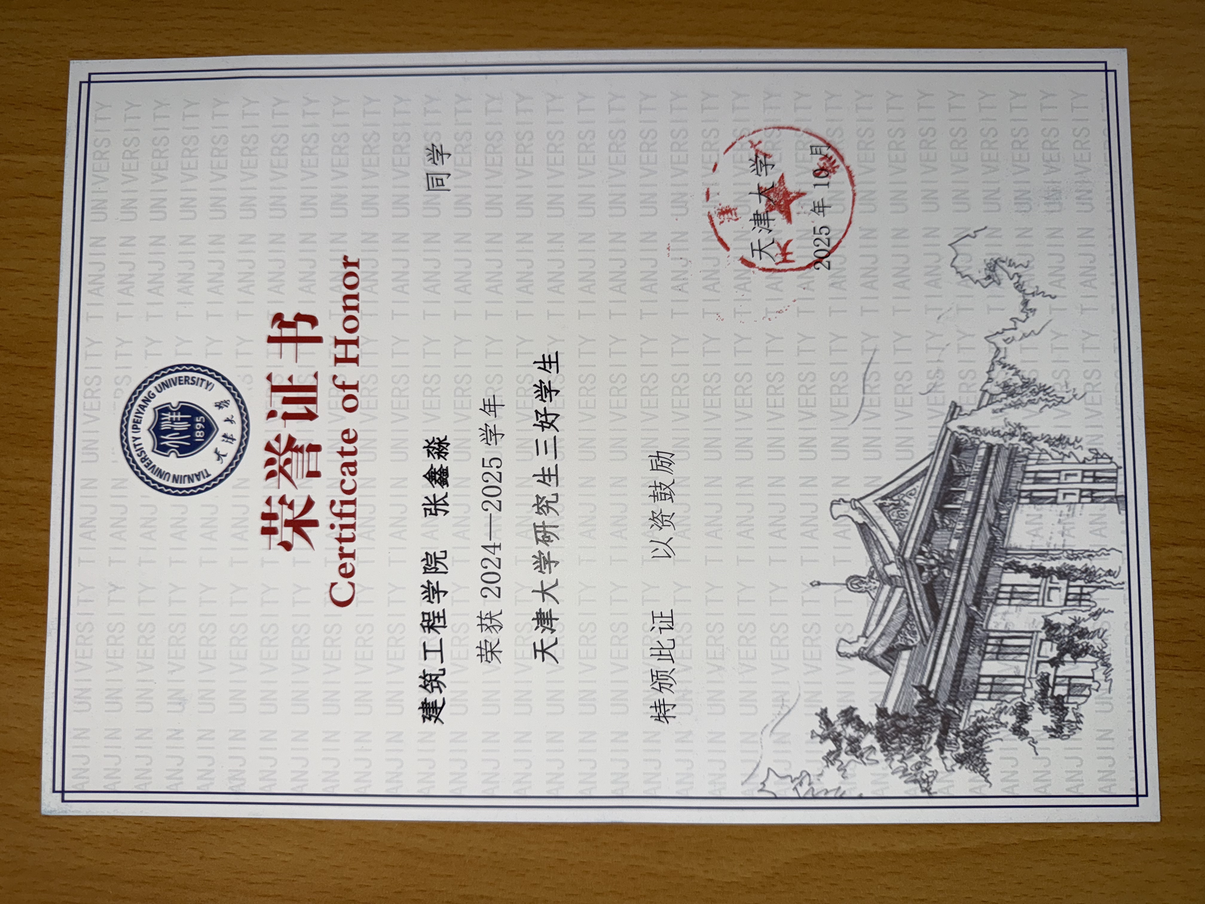 张鑫淼同学荣获三好学生荣誉称号