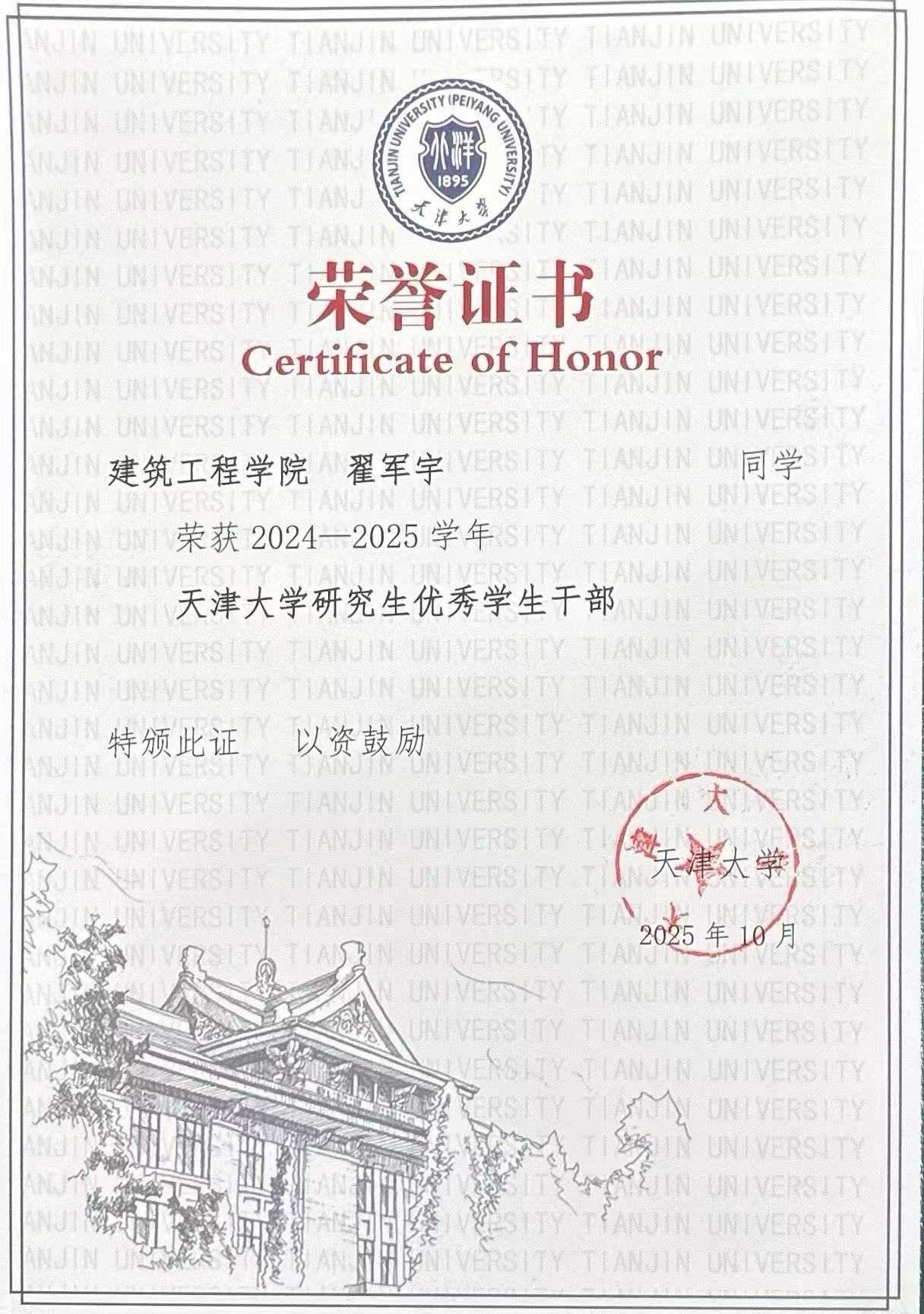 翟军宇同学荣获优秀学生干部荣誉称号
